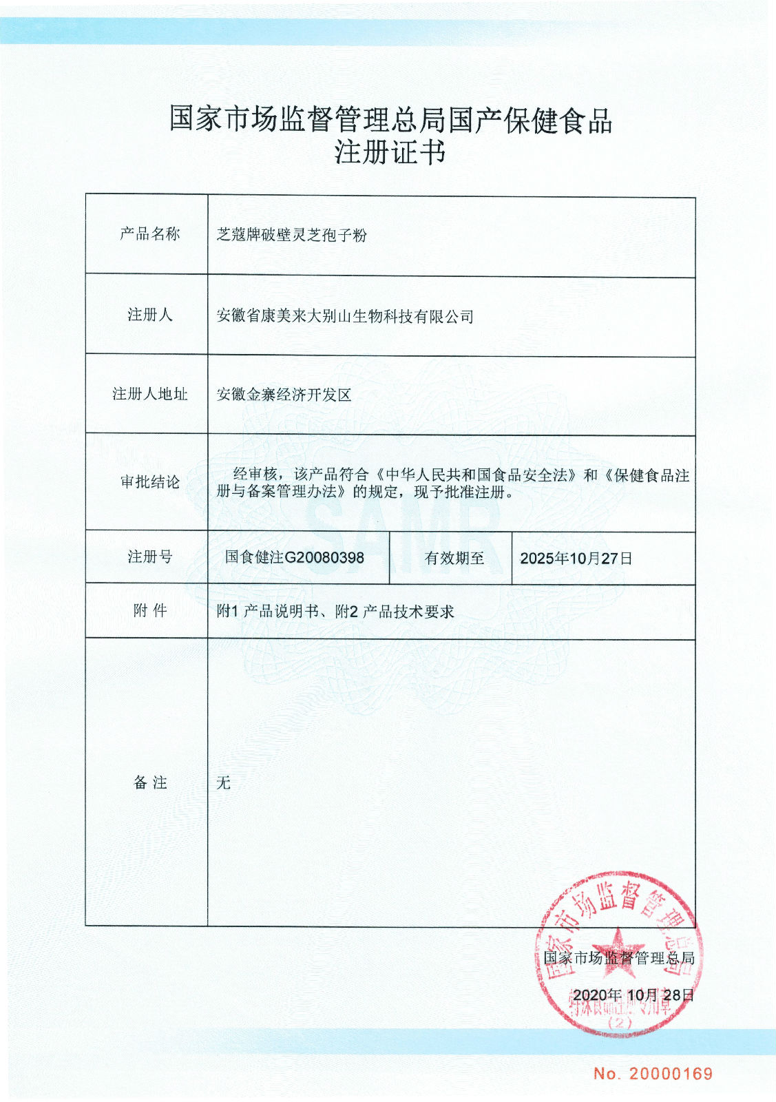 安徽省康美来大别山生物科技有限公司国产保健食品芝蔻牌破壁灵芝孢子粉,于2020年10月28日通过国家市场监督管理总局批准再审注册,注册号:国食健注G20080398,现予告知。