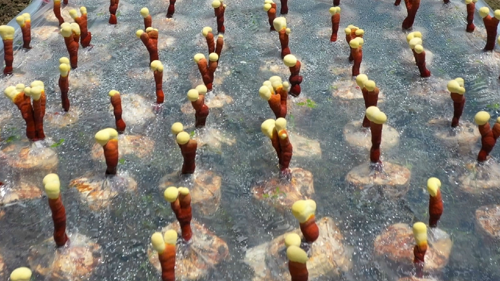 走进灵芝基地,一排排整齐的大棚严整壮阔,与四周连绵的青山相映成趣,棚内一棵棵灵芝整齐排列,朵朵嫩蕾色彩娇艳,构成了一幅美丽的夏日画卷。黄总介绍:这块基地面积20亩,菌棒已开始发芽,正处于菌杆生长阶段。沈业寿教授考察后指出:现蕾阶段的灵芝需要精心观察护理,防止杂菌感染。