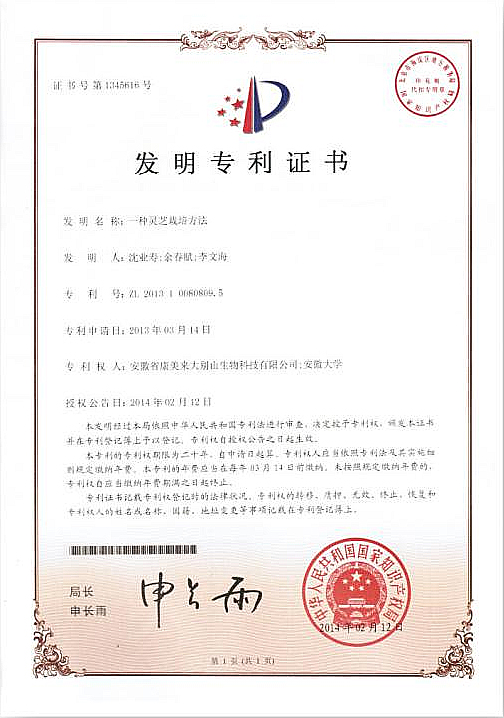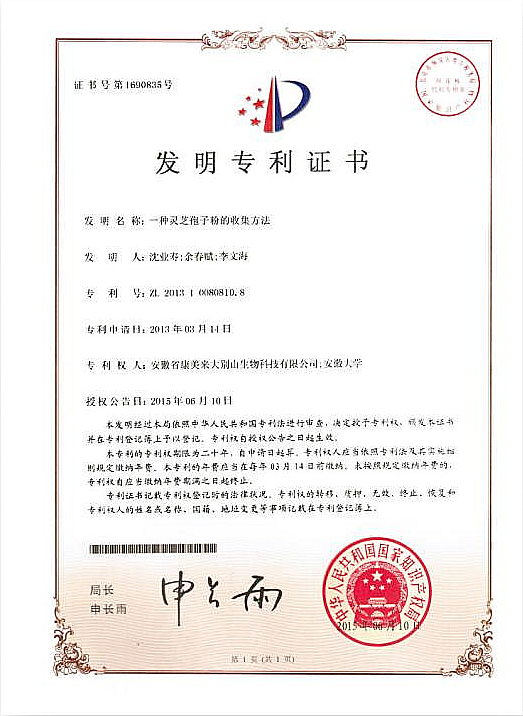 六、应用国家发明专利技术。我公司通过自主科技创新,拥有两项国家发明专利技术:“一种灵芝栽培方法”,专利号:ZL201310080809.5 ;“一种灵芝孢子粉的收集方法”,专利号:ZL201310080810.8。
