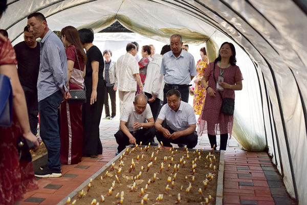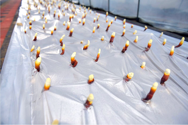 早期栽培的灵芝已长出嫩芽,色泽鲜艳,整齐排列,迎接远方的客人。
