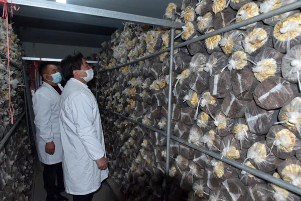 余董到基地最关心的是今年菌棒生产和养菌情况。来到新建的菌棒生产基地,基地负责人黄总介绍:完全按照公司制定药材标准生产,选用最优最合适的多年生椴木生产菌棒。