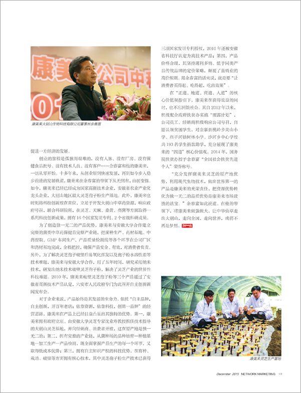 候普传媒《直销》杂志2015年12月刊总130期报道康美来公司。