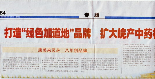 《安徽日报》于2012年8月31日,专版介绍皖药振兴发展情况及成功品牌展示,专篇大题目为《打造“绿色加道地”品牌,扩大皖产中药材影响》,康美来公司作为省药监局推荐的六家著名皖药品牌之一,在专刊上报道,题目为“康美来灵芝,八年创品牌”。