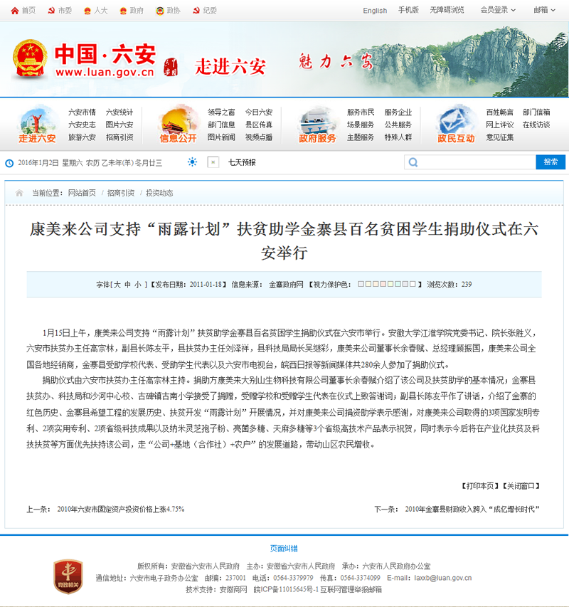 六安市举行。安徽大学江淮学院党委书记、院长张胜义,六安市扶贫办主任高宗林,副县长陈友平,县扶贫办主任刘泽祥,县科技局局长吴继彩,康美来公司董事长余春赋、总经理顾振国,康美来公司全国各地经销商,金寨县受助学校代表、受助学生代表以及六安市电视台,皖西日报等新闻媒体共280余人参加了捐助仪式。
