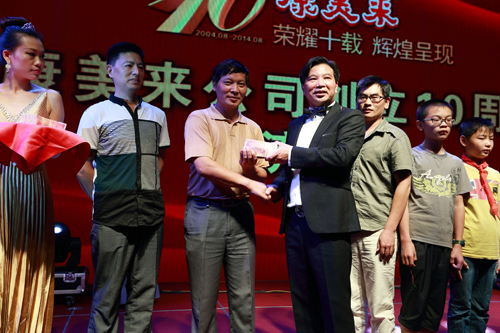 2014年8月,在康美来公司10周年创业辉煌晚会上,余春赋董事长把110400元现金现场捐助给金寨县沙河乡中心小学、燕子河镇树林小学、青山镇姜河中心小学184名贫困学生,支持政府雨露计划。公司自2014年起,发动公司干部和伙伴开展结对扶贫助学,奉献爱心,回馈社会。2014年由过去的117名,增加到184名学生,由2所小学增加到3所小学。扶贫办主任刘泽祥参加捐助活动并讲话。