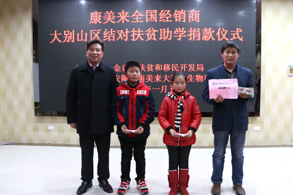 新年伊始,爱心接力。2016年1月5日下午,康美来公司处处欢声笑语、暖意融融。县扶贫和移民开发局领导,康美来公司董事长余春富先生和来自沙河乡中心小学、燕子河镇树林小学、桃岭乡关山小学的师生们欢聚一堂,隆重举行康美来公司支持政府“雨露计划”结对捐资助学仪式。