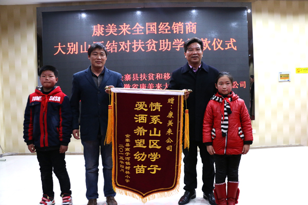 捐助仪式上,燕子河树林小学的师生代表为康美来公司赠送了“情系山区学子,爱洒希望幼苗”的锦旗。