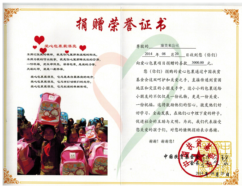为了帮助贫困地区的小学生能够顺利上学,缓解学生家庭的生活压力,2014年8月,康美来公司积极参加中国扶贫基金会发起的全民公益活动,组织了爱心包裹温暖行动,踊跃捐款3000元。